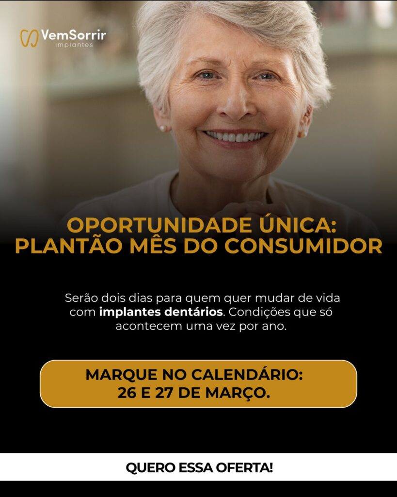 Clínica Vem Sorrir Santos | Promoção Mês do Consumidor – Março 2026 Publicado em 11/03/2026 por Grupo Vem Sorrir Promoção imperdível! Agende uma consulta Siga-nos no Instagram Visite o site da clínica Entre em contato: Vem Sorrir Santos